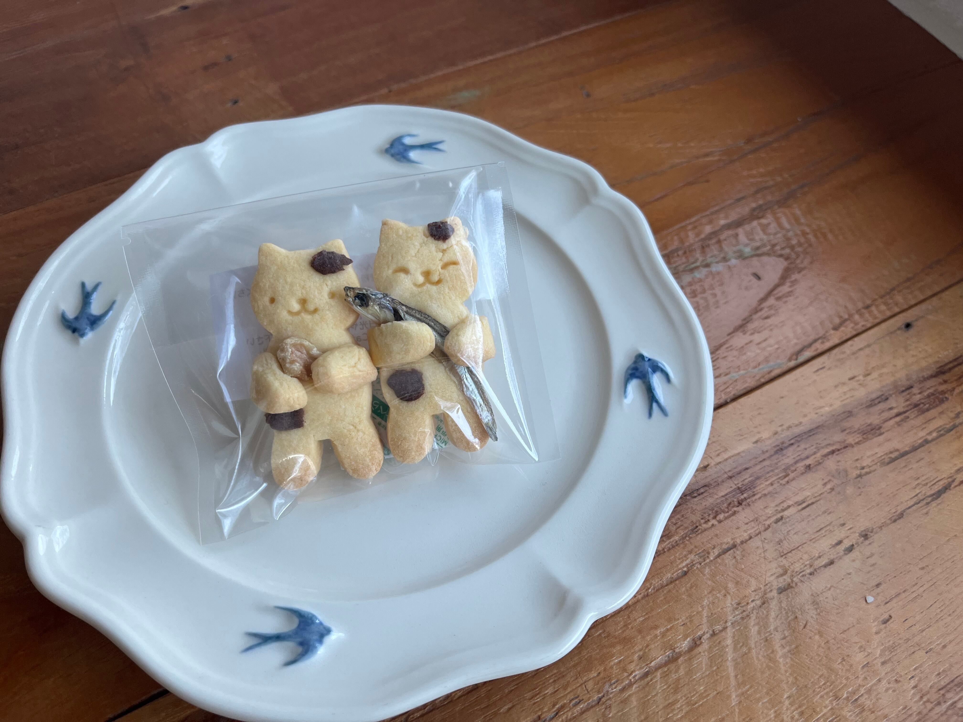 当店で人気のくるみと煮干しを抱っこした2匹のねこのクッキーです。(人間用です)